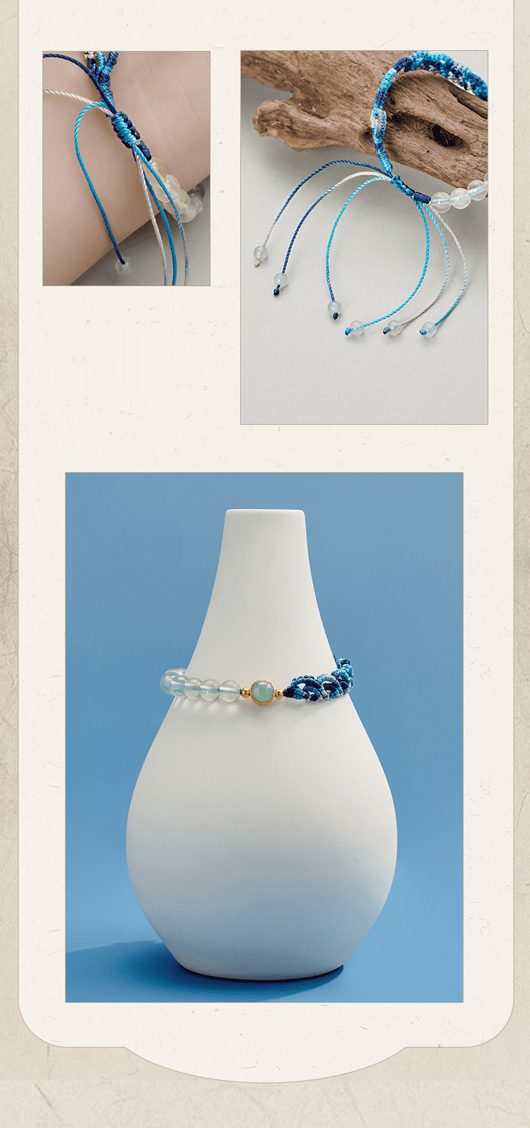 A: The bracelet is made from Blue Jadeite and Green Fluorite, known for their spiritual and healing properties.