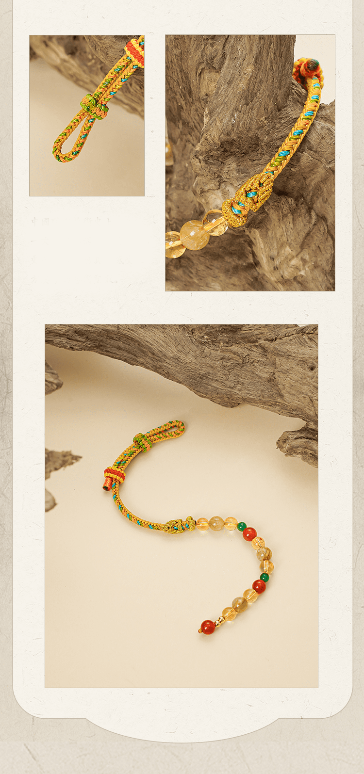 A: The bracelet combines red agate, citrine, and rutilated quartz, each chosen for their spiritual and protective properties.