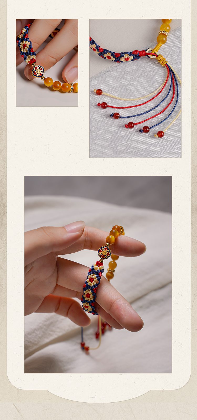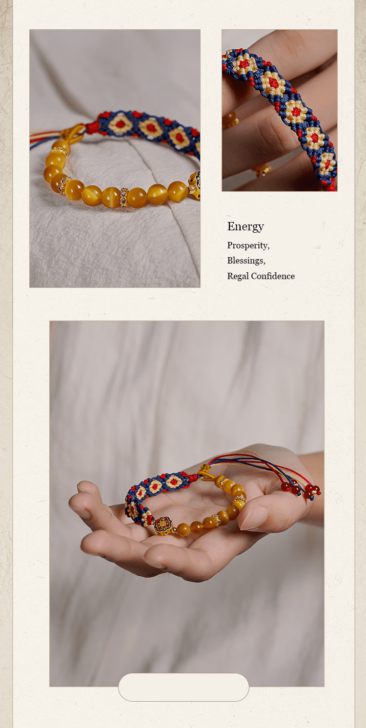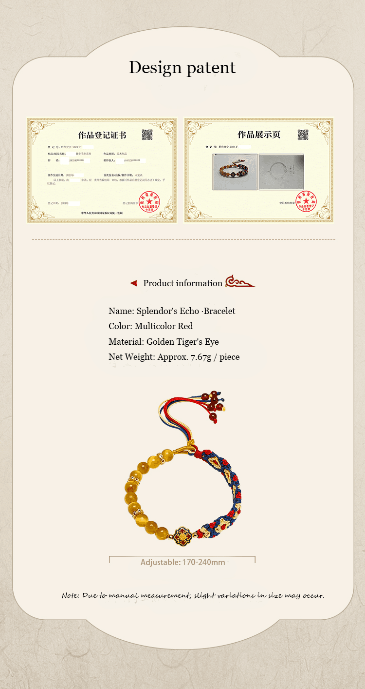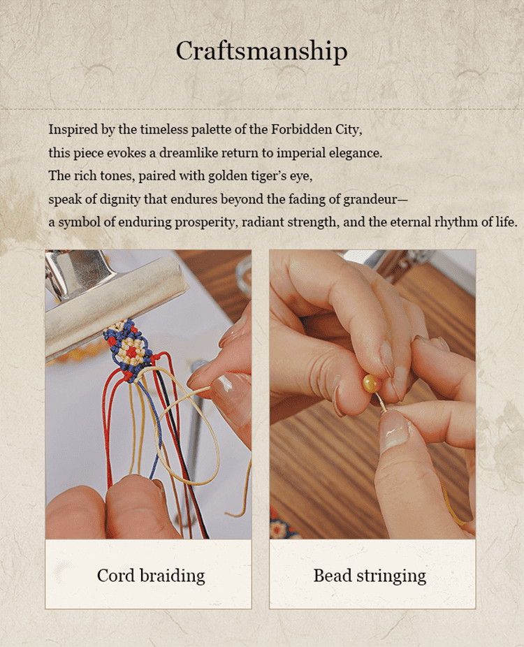 Drawing inspiration from the timeless color palette of the Forbidden City, this bracelet evokes a dreamlike return to imperial elegance. The warm multicolored reds combined with golden tiger’s eye gemstones mirror the lingering glow of palace walls at dusk — a symbol of enduring blessings, regal confidence, and prosperity that transcends time.