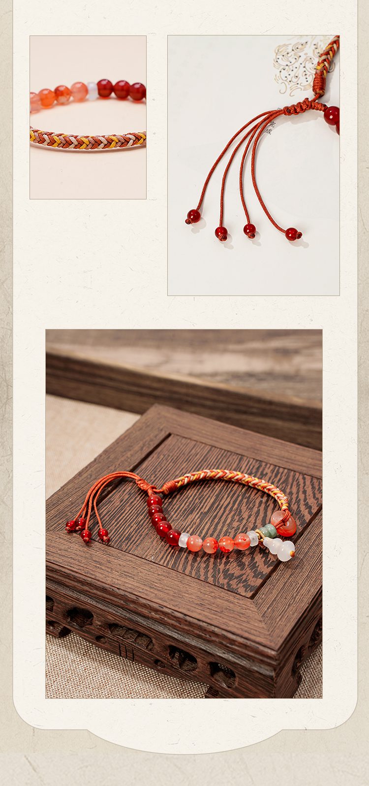 A:Red Agate: Symbolizes passion, trust, and emotional protection. Chalcedony: Encourages compassion, openness, and emotional balance. Jadeite: Traditionally known for harmony, good fortune, and grace. Together, they embody love that lasts, friendship that uplifts, and inner beauty that glows.
