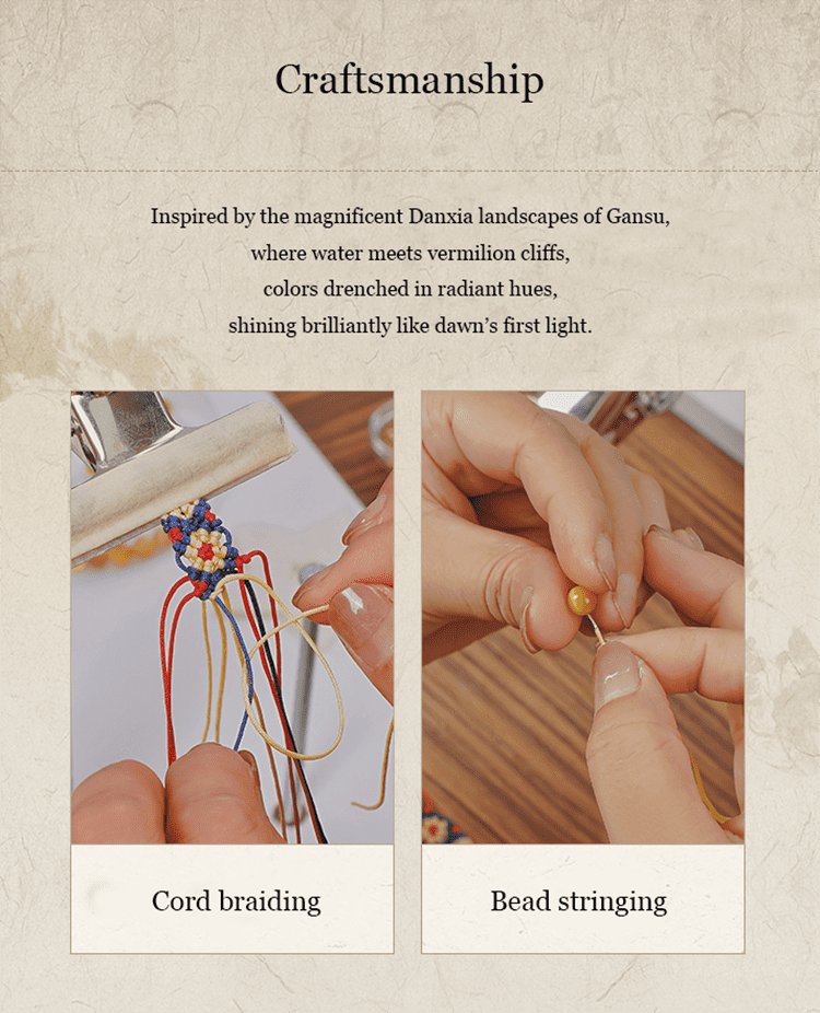This bracelet draws inspiration from the awe-inspiring Danxia landscapes of Gansu, China—where vermilion cliffs rise like flames and sunlight bathes the earth in brilliant reds and golds. It captures the sacred moment when earth meets light, and dreams take shape in color.